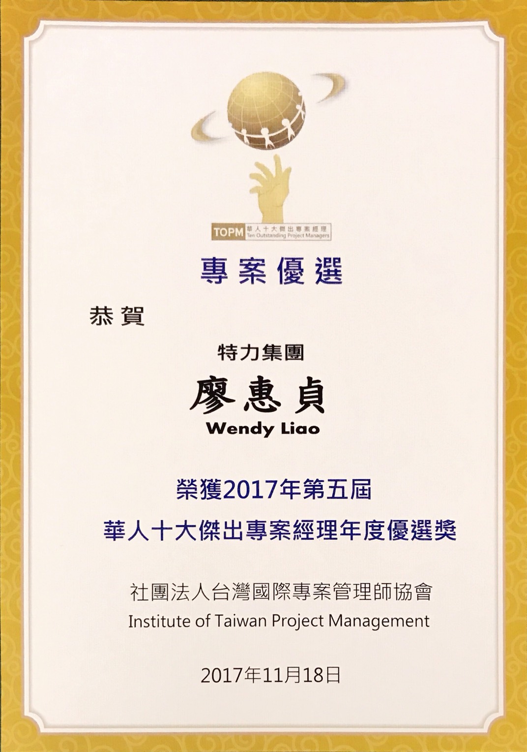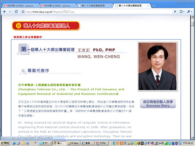 1.稀有性:目前全球有40萬位華人PMP, 但是得到華人十大傑出專案經理獎一屆僅有10位.。