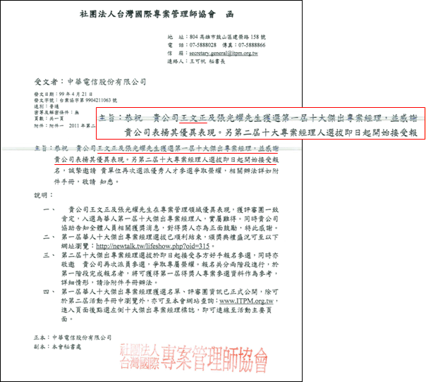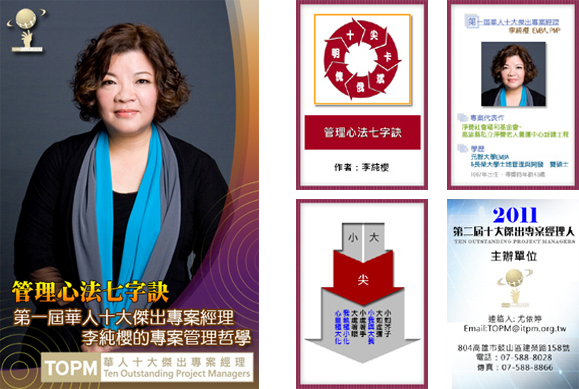 9.尊榮性:可在自己的簡報或名片打上華人十大傑出專案經理尊榮的徽章(Logo)。