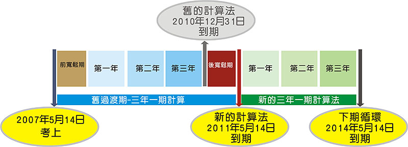 簡述如下: 【2008年系統變更前考上者】 A. 第一個 CCR Cycle 將增加第二段寬鬆時間 (換言之:無論哪天去考試,第一個 Cycle 時間均為四年整) 《以 ” 2007年5月14日” 考上為例》 1st Cycle 舊的到期日: 2007/05/14~2007/12/31 為前寬鬆期 + 3 年 ==> 到期日為 2010/12/31 1st Cycle 新的到期日: 2007/05/14~2007/12/31 為前寬鬆期 + 3 年 + 2011/01/01~05/14 後寬鬆期 ==> 到期日為 2011/05/14